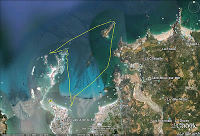 Très rapidement, trois groupes se forment. Un peloton de tête, et deux autres groupes de niveau plus ou moins homogène. Les premiers s'empressent de virer la première bouée pour filer sur la pointe et faire du rase cailloux avant de plonger pour un petit downwind dans l'Arguenon. Le soleil est en face, le vent lèger, il fait chaud, c'est assez dur. Le retour est assez facile face à ce vent et ce clapot peu prononcés. Mais dès la pointe repassée, les choses changent radicalement. Le vent monte, la houle grossit et un clapot croisé vient corser le tout. Le courant nous rentre dans la baie et le bateau ouvreur, malgré son drapeau aux couleurs rasta de Rata Gata, n'est pas toujours très visible. nous atteignons enfin la perche au milieu de la baie pour enchaîner sur un long downwind. Beaucoup de clapot mais ça part quand même en surf. Un peu de répit mais la bataille n'est pas terminée. Nous rentrons dans la baie de beaussais, le plan d'eau se lisse. Dernière bouée avant le port et le retour. La remontée commence cool, avec une mer calme, abritée du vent. Plus nous remontons plus celui forcit et une fois le port franchi, c'est l'enfer qui nous attend. Un finish très très dur. 500 mètres contre le courant, le vent (17 noeuds), la houle de travers et le clapot de face... Quel est le con qui a eu l'idée d'un parcours pareil? Et ce finish? comme si après 10 km, on n'en avait pas eu assez. Le con, c'est moi. A chaque coup de pagaie, je me maudis, la planche tape, ça n'avance pas. Tant bien que mal, j'atteins la bouée finale et retour à la plage en downwind. Enfin le sable.
